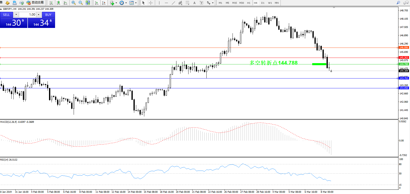 交易策略:144.788下方看跌,目标143.763、143.050