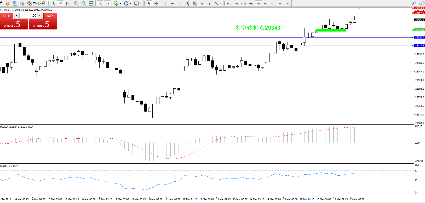 恒指HK50 ——1小时K线图显示: