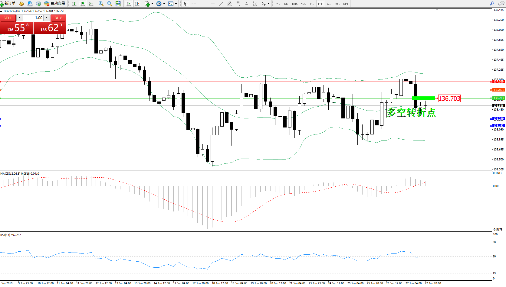 交易策略:136.703下方看跌,目标136.299、136.163