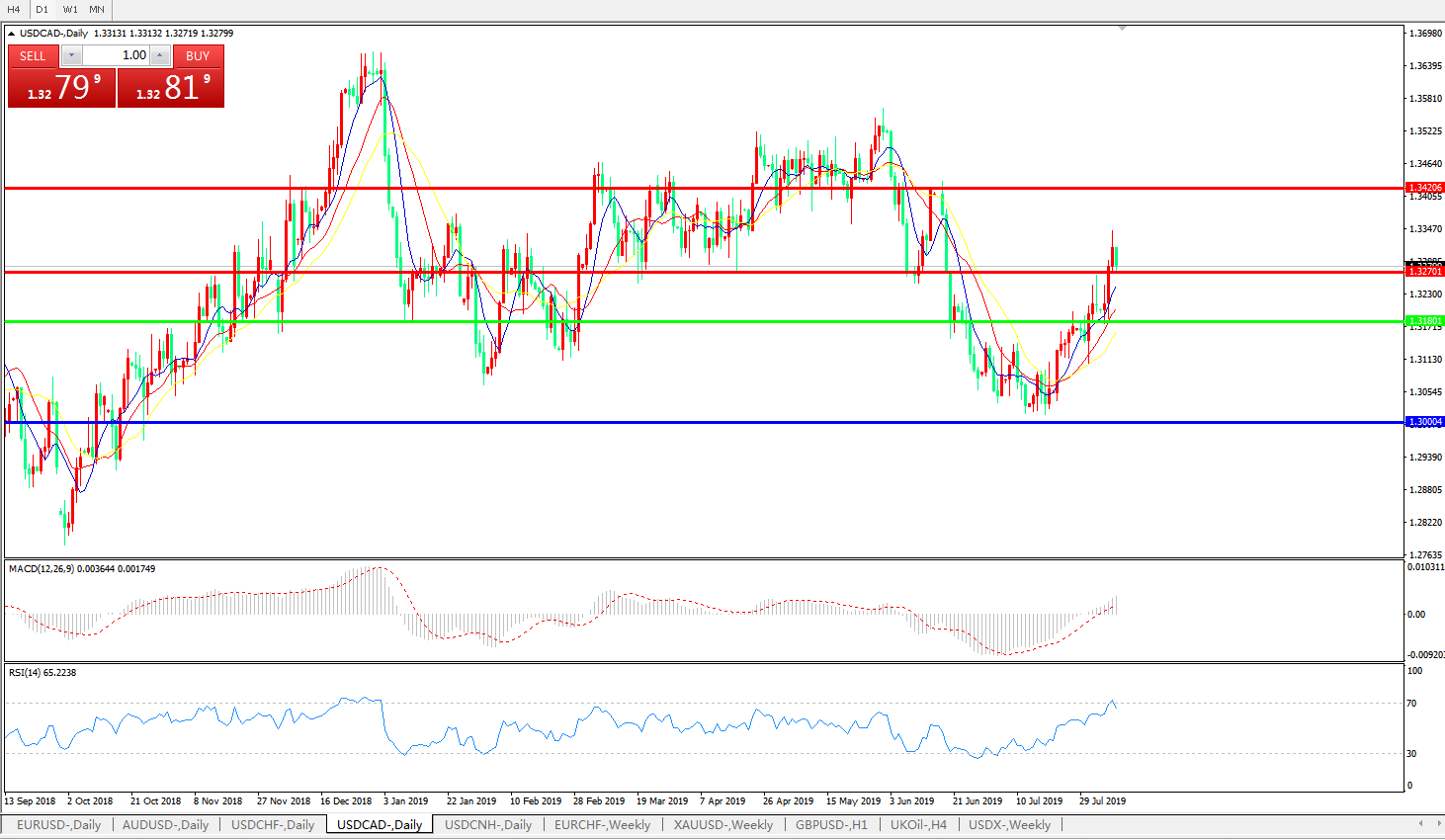 美元兑加元在周三北美时段早盘继续走强,升至6月18日以来七周新高。上周以来,在美元走强同时,全球贸易局势却再度出现变数,这都令商品系货币遭受重挫,就连前期走势异常坚挺的加元都未能幸免;而在周三日内,在新西兰联储意外降息50基点震惊世界之后,投资者纷纷跟风抛售包括加元在内的商品货币,而此后在德国工业生产数据大幅不佳后,油价的进一步跳水更是连累石油系货币加元加速下跌,而美股在隔夜反弹之后的再度暴跌,也令风险情绪雪上加霜。市场正在等待此后的加拿大PMI数据以及美国EIA原油库存,若数据不够亮眼,美元兑加元仍有进一步上行的空间,可能冲击前期1.3430一线的阶段高位。