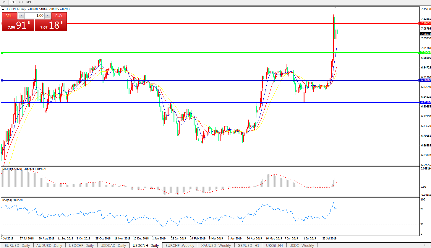 备选策略: 在7.0000之下,看跌,目标价位为6.9010,然后为6.8210。