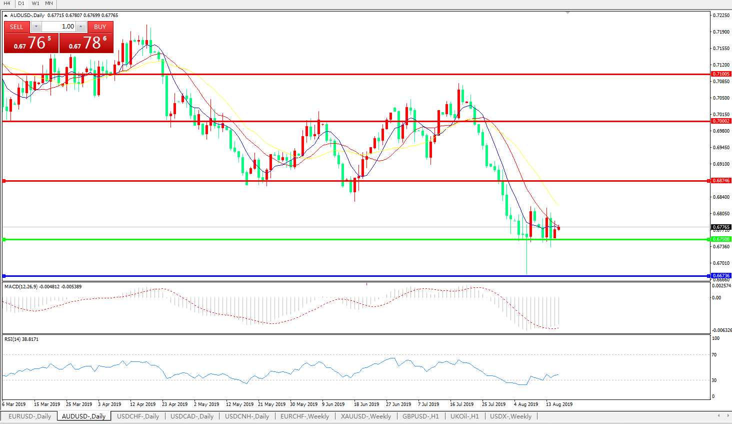 澳元兑美元在周四亚洲时段再现反弹,基本收复了周三的跌势,从日K线度上来看,在行情趋势底部区间进行的剧烈震荡行情还在延续,市场多空交火激烈,突破方向前景难料; 日内推动澳元走强的主要消息是澳洲7月就业数据意外大好,这对冲了来自贸易领域的负面情绪,也令澳洲联储在此后进一步降息的几率下降。与此同时,此前因为美国长短期国债收益率出现倒挂而诱发的市场恐慌避险情绪,在周四也有所缓和;这使得过去一周以来,澳元兑美元都在0.6730-0.6825这一区间内反复震荡,虽然每一天的日内波动看似剧烈,但实际行情趋势却依然不明,这正是行情在夏季交投清淡季节的典型形态,各路投资者也正在期盼此后更多更强力的基本面消息能够给汇市指出明确的方向 。