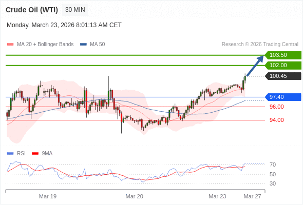 在 97.40 之上,看涨,目标价位为 102.00 ,然后为 103.50 。