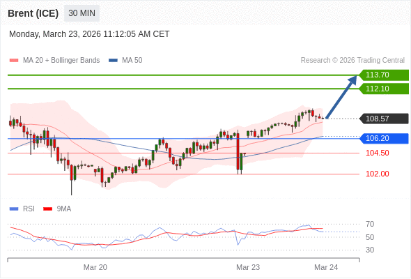 布伦特原油 (ICE) (M6) 当日内: 在106.20之上,看涨。