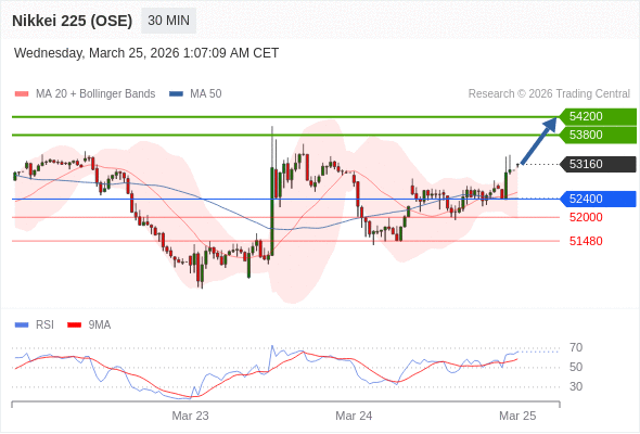 在 52400 之上,看涨,目标价位为 53800 ,然后为 54200 。