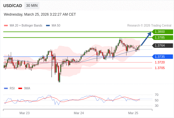 在 1.3735 之上,看涨,目标价位为 1.3785 ,然后为 1.3800 。