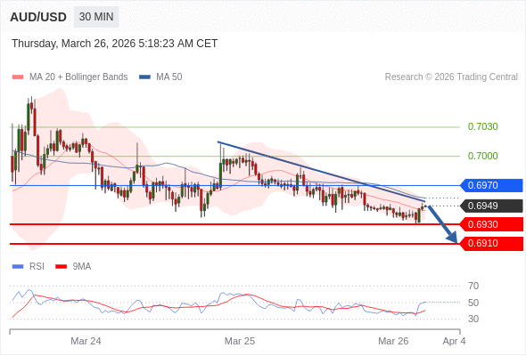 在 0.6970 之下,看跌,目标价位为 0.6930 ,然后为 0.6910 。