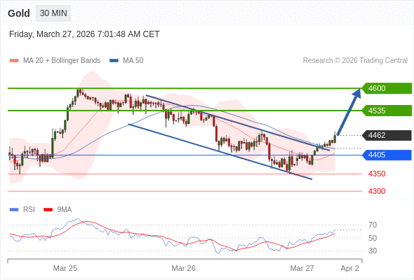 交易策略: 在 4405 之上,看涨,目标价位为 4535 ,然后为 4600 。