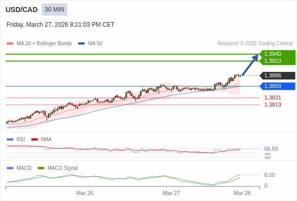 美元/加元 当日内 : 看涨,当 1.3859 为支撑位。