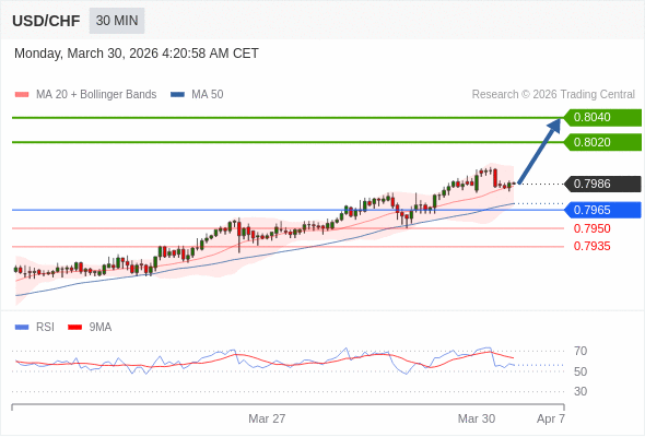 在 0.7965 之上,看涨,目标价位为 0.8020 ,然后为 0.8040 。