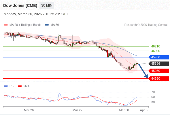 在 45700 之下,看跌,目标价位为 45050 ,然后为 44690 。