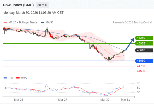 在 45050 之上,看涨,目标价位为 45985 ,然后为 46280 。