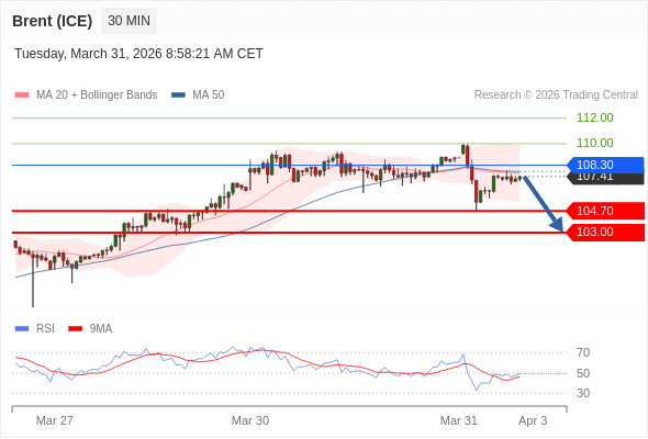 交易策略: 在 108.30 之下,看跌,目标价位为 104.70 ,然后为 103.00 。