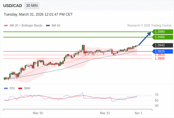 在 1.3925 之上,看涨,目标价位为 1.3965 ,然后为 1.3980 。