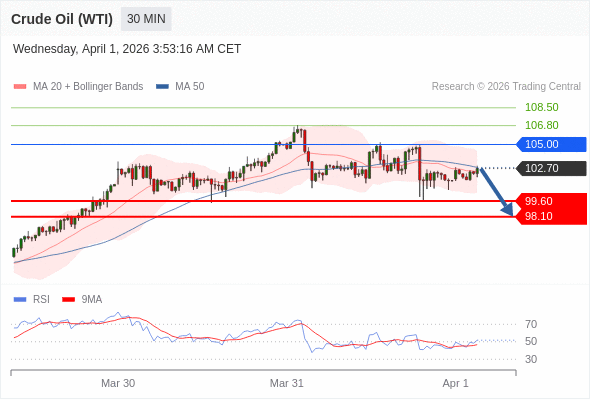 交易策略: 在 105.00 之下,看跌,目标价位为 99.60 ,然后为 98.10 。