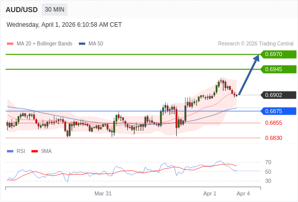 在 0.6875 之上,看涨,目标价位为 0.6945 ,然后为 0.6970 。