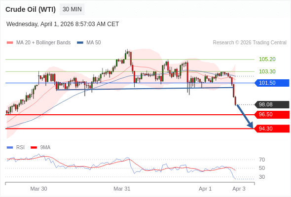 交易策略: 在 101.50 之下,看跌,目标价位为 96.50 ,然后为 94.30 。