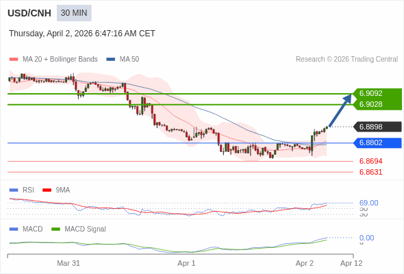 替代方案: 在6.8802以下,期待6.8694和6.8631。