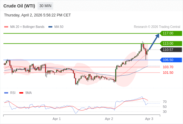 在 106.50 之上,看涨,目标价位为 113.00 ,然后为 117.00 。