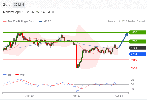 在 4704 之上,看涨,目标价位为 4760 ,然后为 4800 。