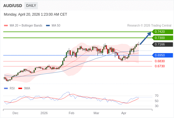 在 0.6950 之上,看涨,目标价位为 0.7300 ,然后为 0.7420 。