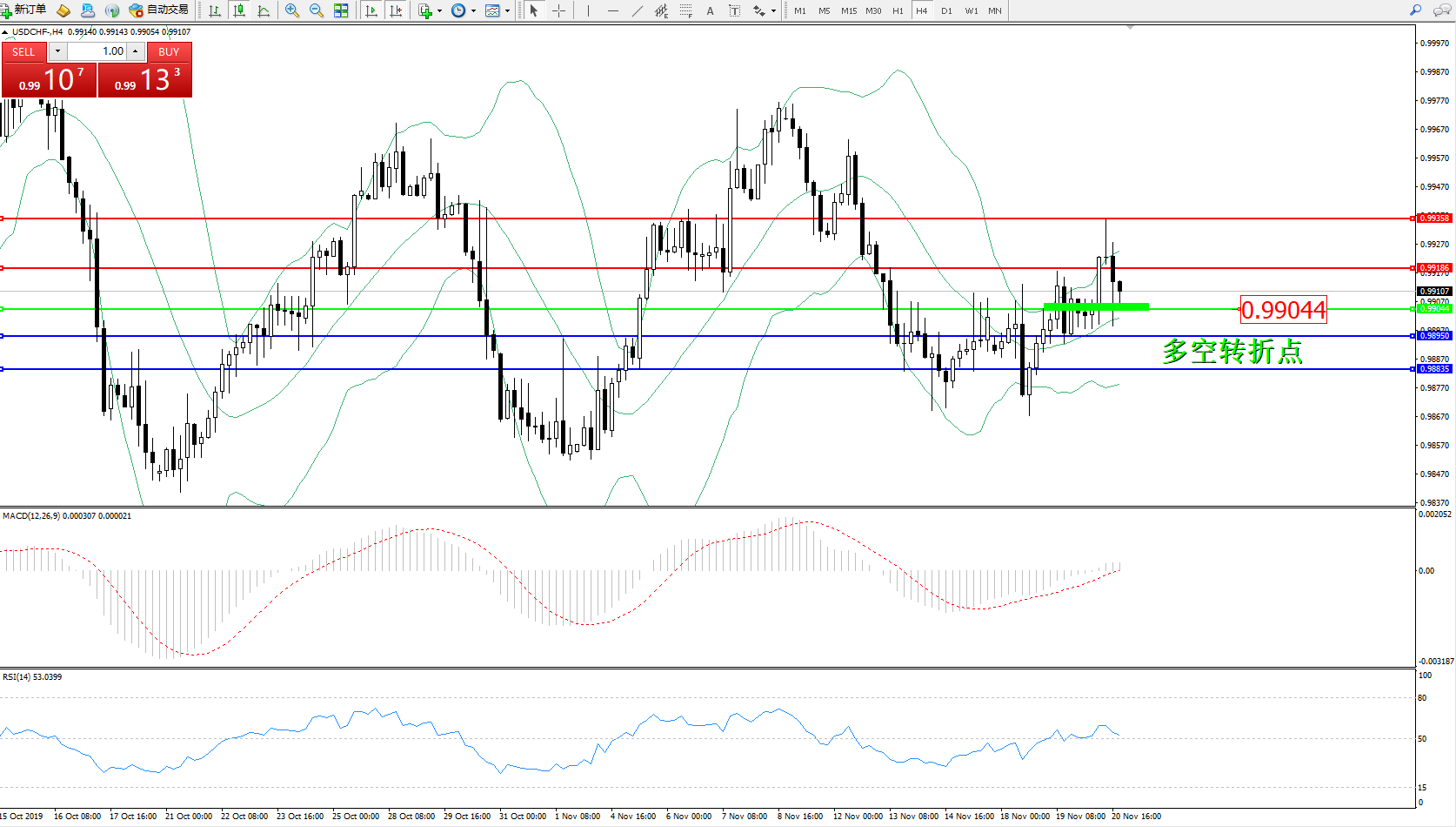交易策略:0.99044上方看涨,目标0.99186、0.99358
