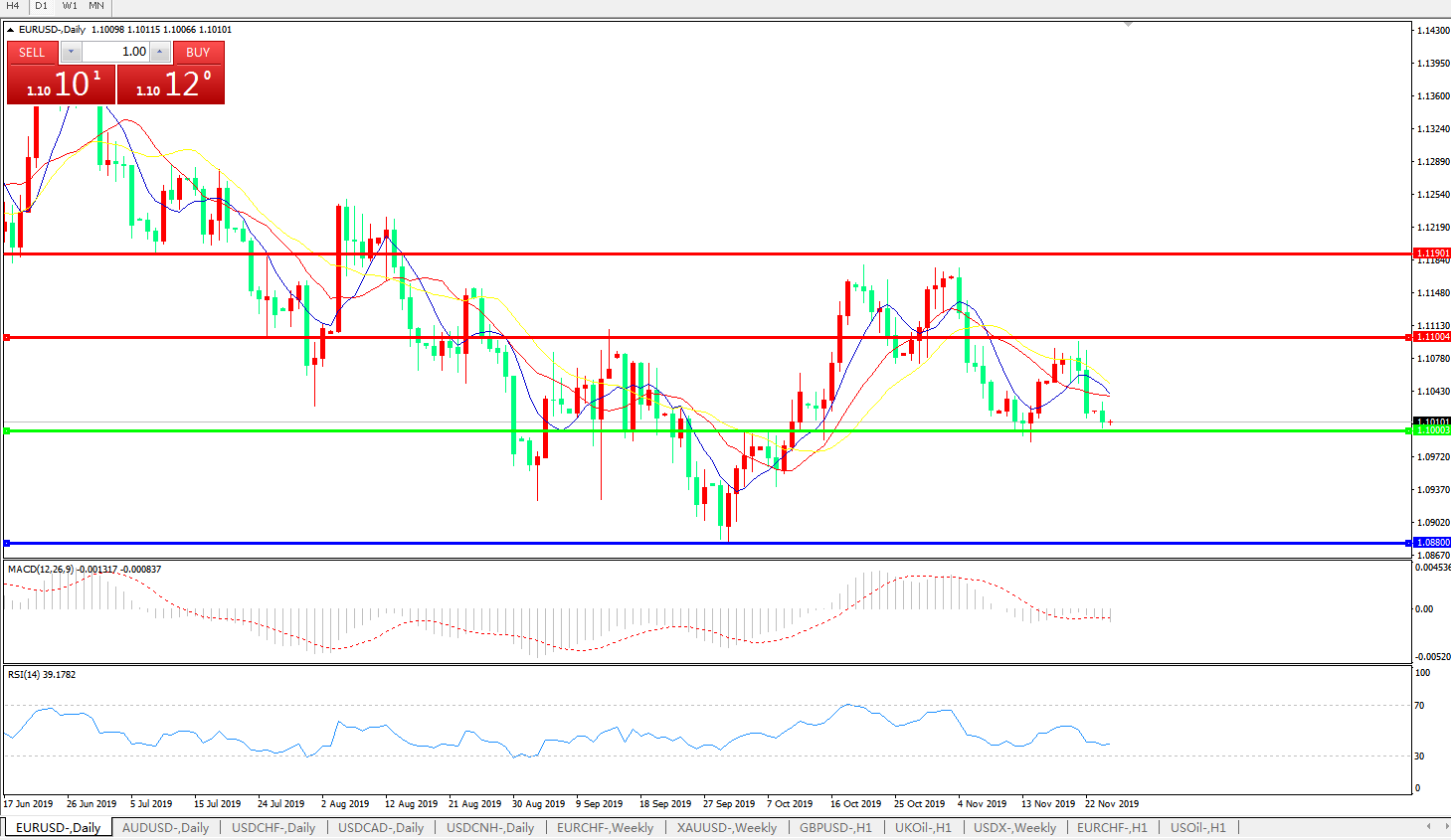 技术面简析:日图均线再度呈空头排列,汇价继续走低试探1.10关口,MACD量能在0轴下方有再度放量的迹象 ,RSI持续走弱,预计汇价短期汇价下行将遭遇下方重要支撑,关注1.1000关口争夺。