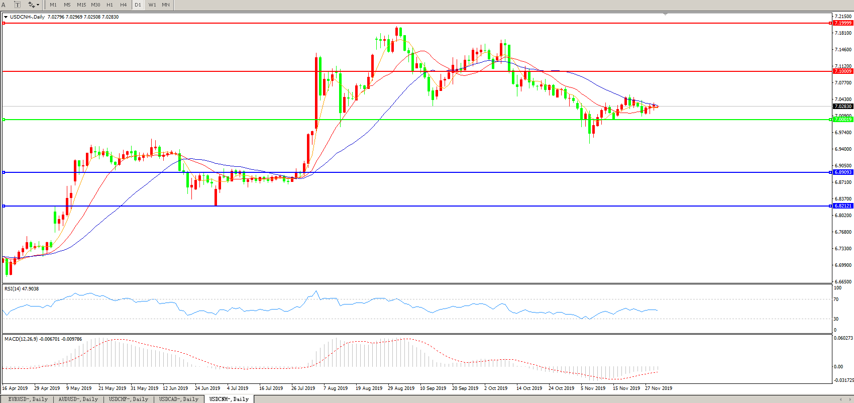 技术面简析:日图均线粘合无明显方向,汇价7.0关口上方偏强整理,MACD运行于0轴下方但量能持续收缩,RSI整理中走低,预计短期汇价将在7.0关口附近整理,中期汇价需等待美元指数及中美贸易谈判最新进展指引。