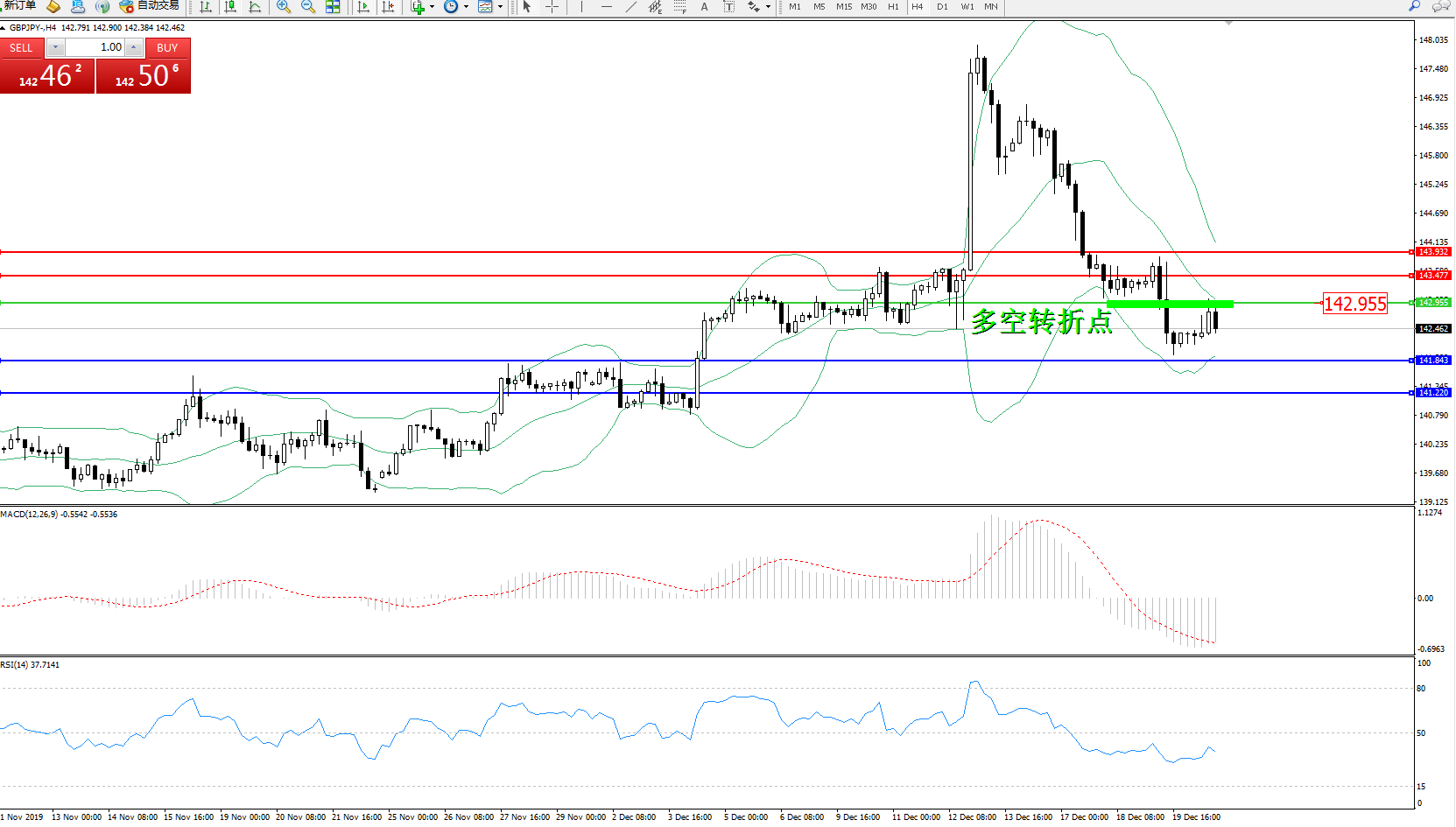 交易策略:142.955下方看跌,目标141.843141.220