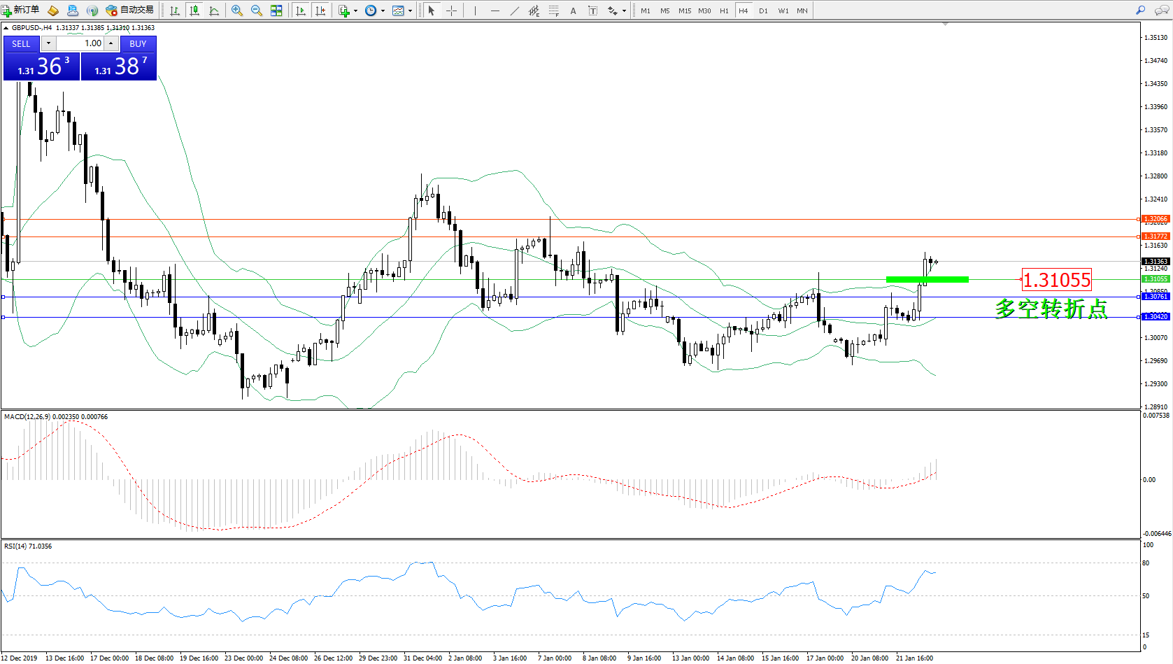 交易策略:1.31055上方看涨,目标1.31772、1.32066