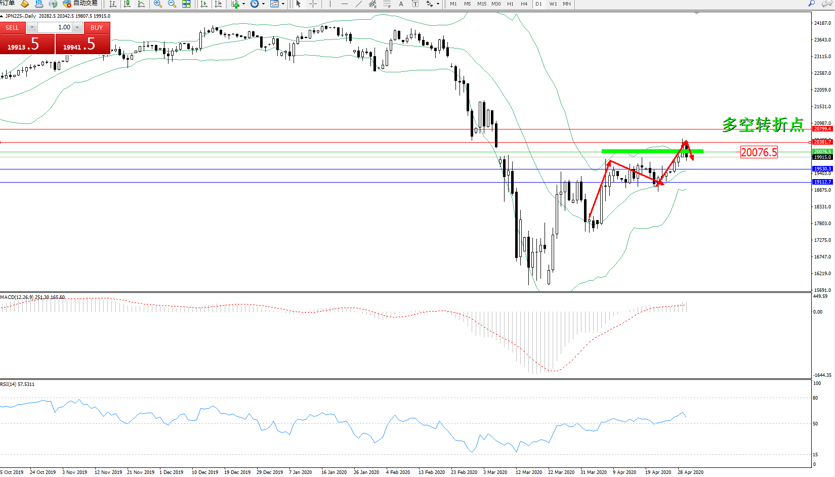 日经225指数4月30日(周四)收盘上涨431.31点,涨幅2.18%,报20202.50点。日本股市周三休市后恢复交易,日经指数跳涨2.5%至七周高位,追上了本周的涨势。亚洲股市周四涨至七周新高,受新冠药物乐观试验结果提振。利德科学的试验性抗病毒药物瑞德西韦将成为新冠肺炎的标准用药,此前周三一项关键临床试验的早期结果显示,该药物有助于加快病患从新冠肺炎中恢复的速度。
