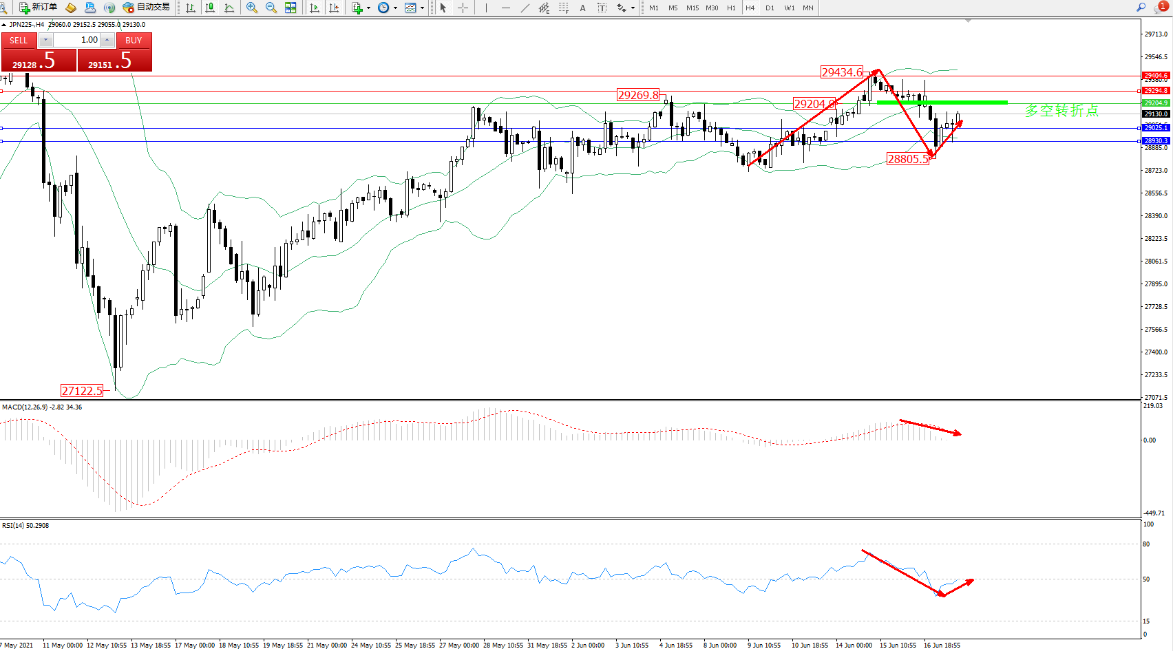 日经指数JPN225——4小时K线图显示: