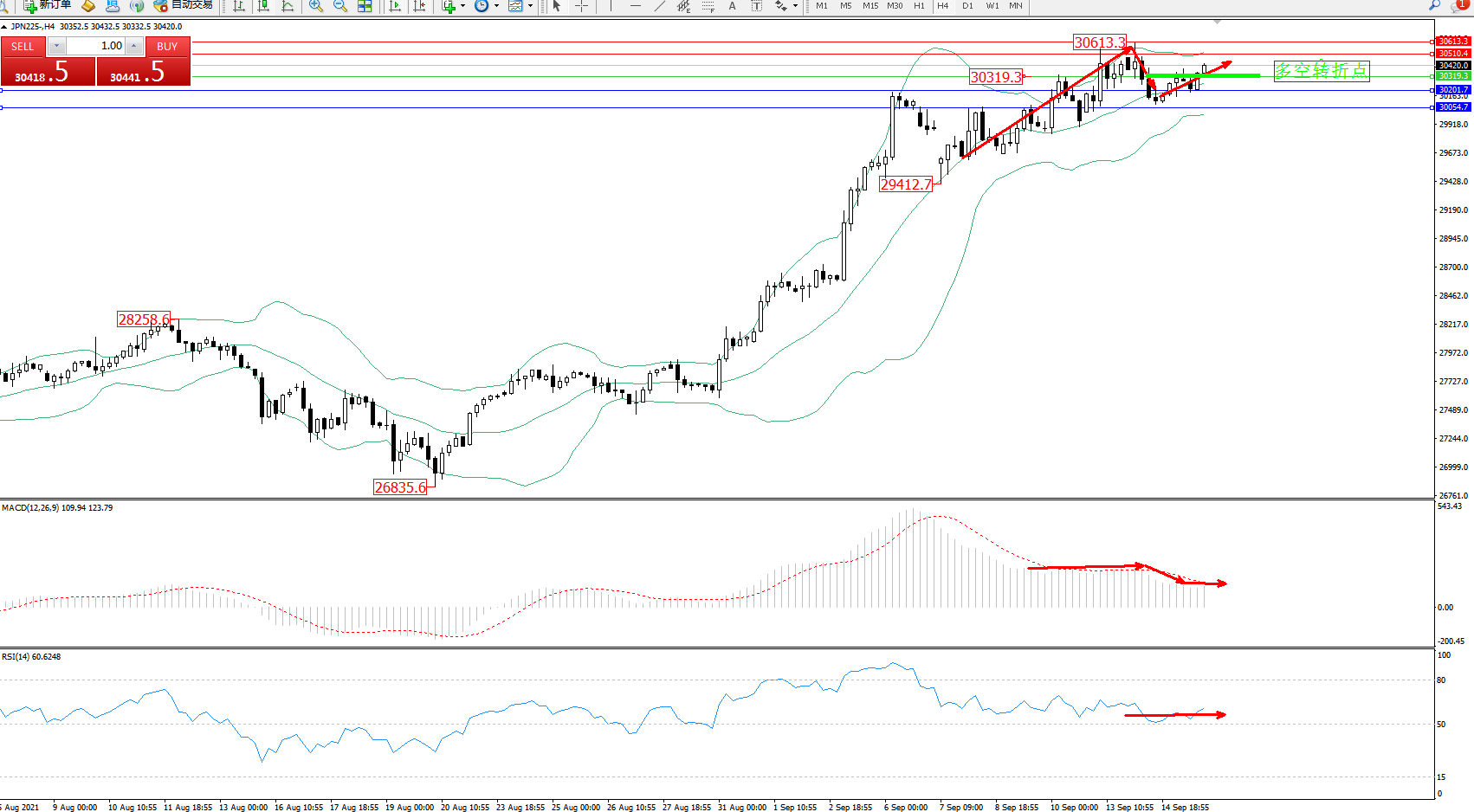 日经指数JPN225——4小时K线图显示: