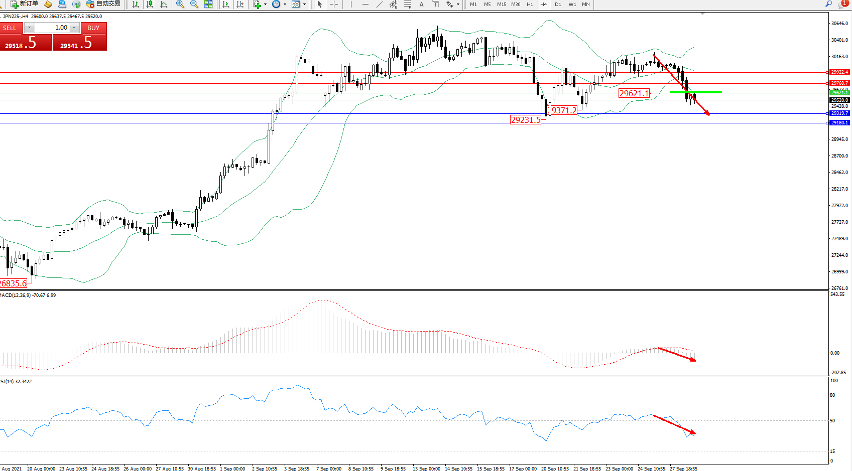 日经指数JPN225——4小时K线图显示: