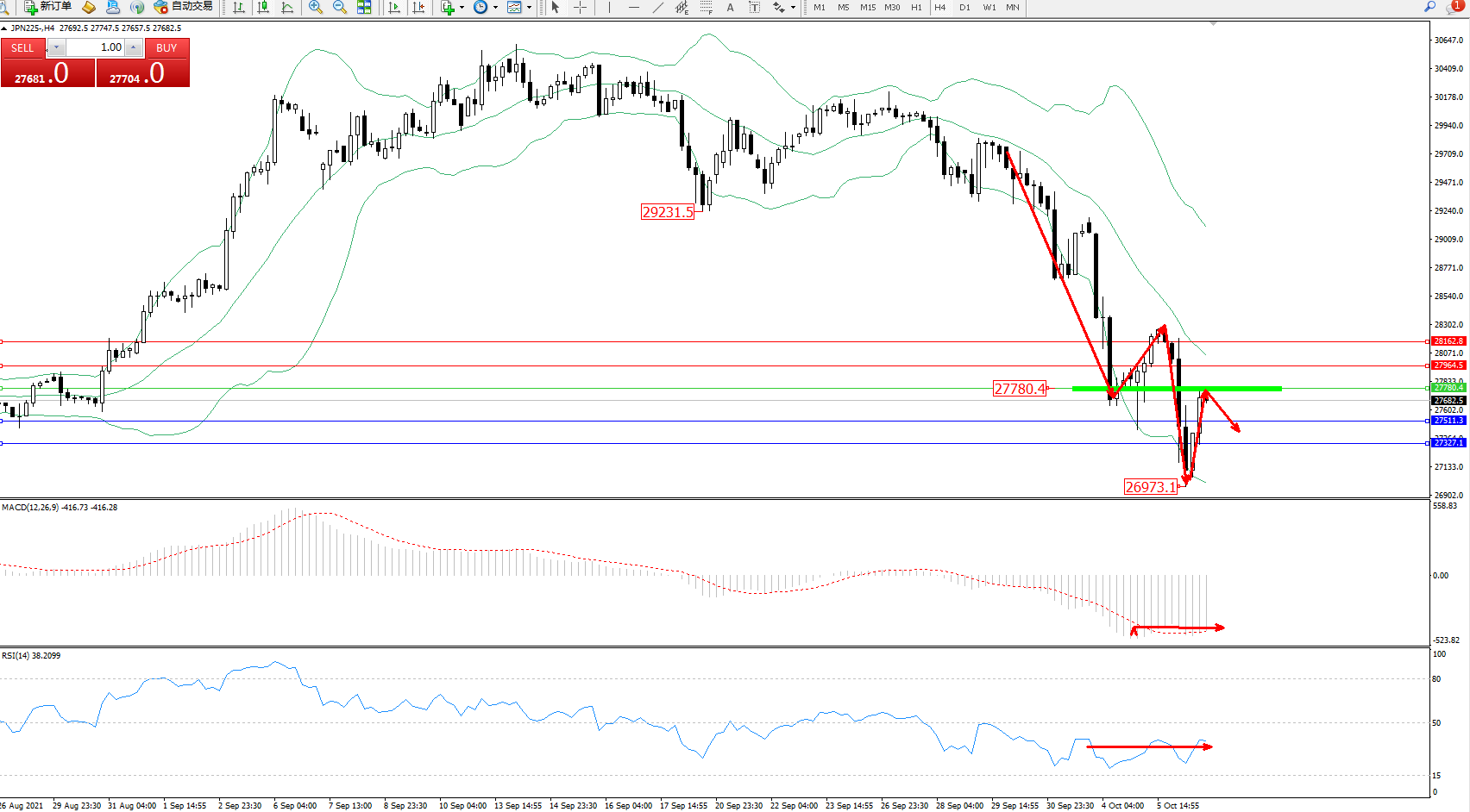 日经指数JPN225——4小时K线图显示: