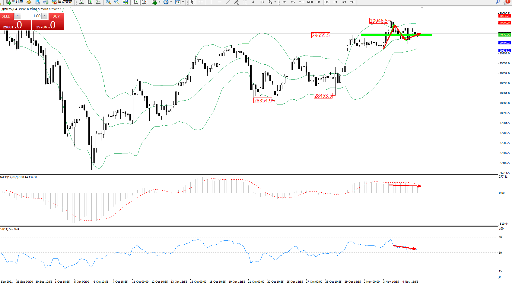 日经指数JPN225——4小时K线图显示: