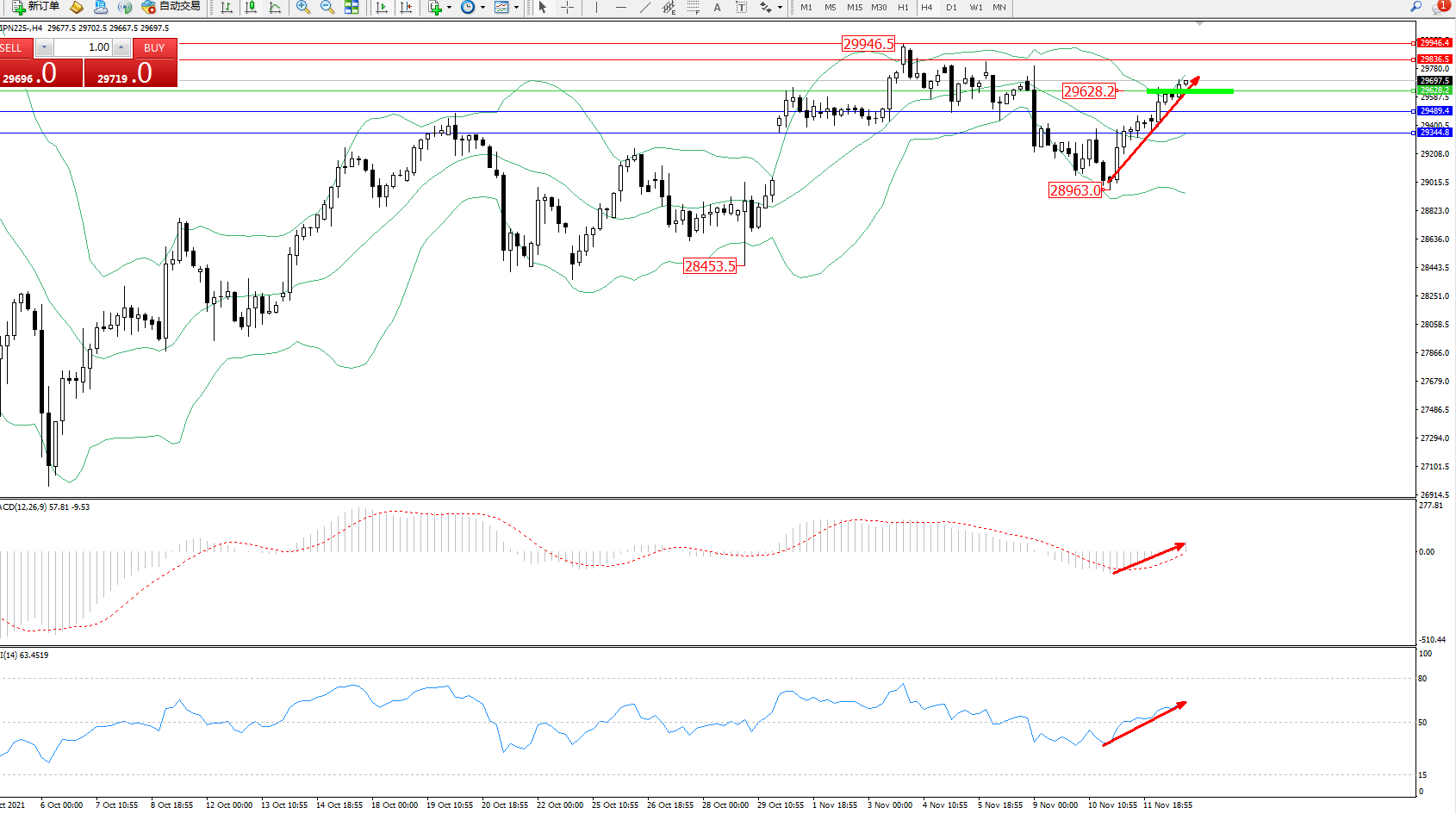 日经指数JPN225——4小时K线图显示: