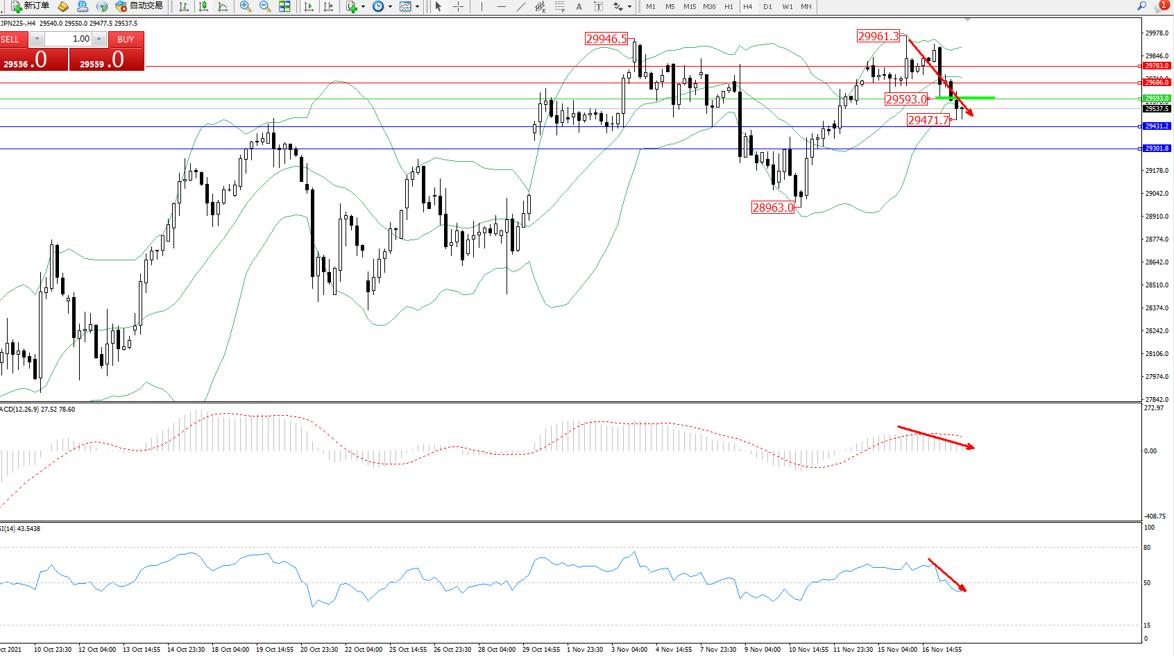 日经指数JPN225——4小时K线图显示: