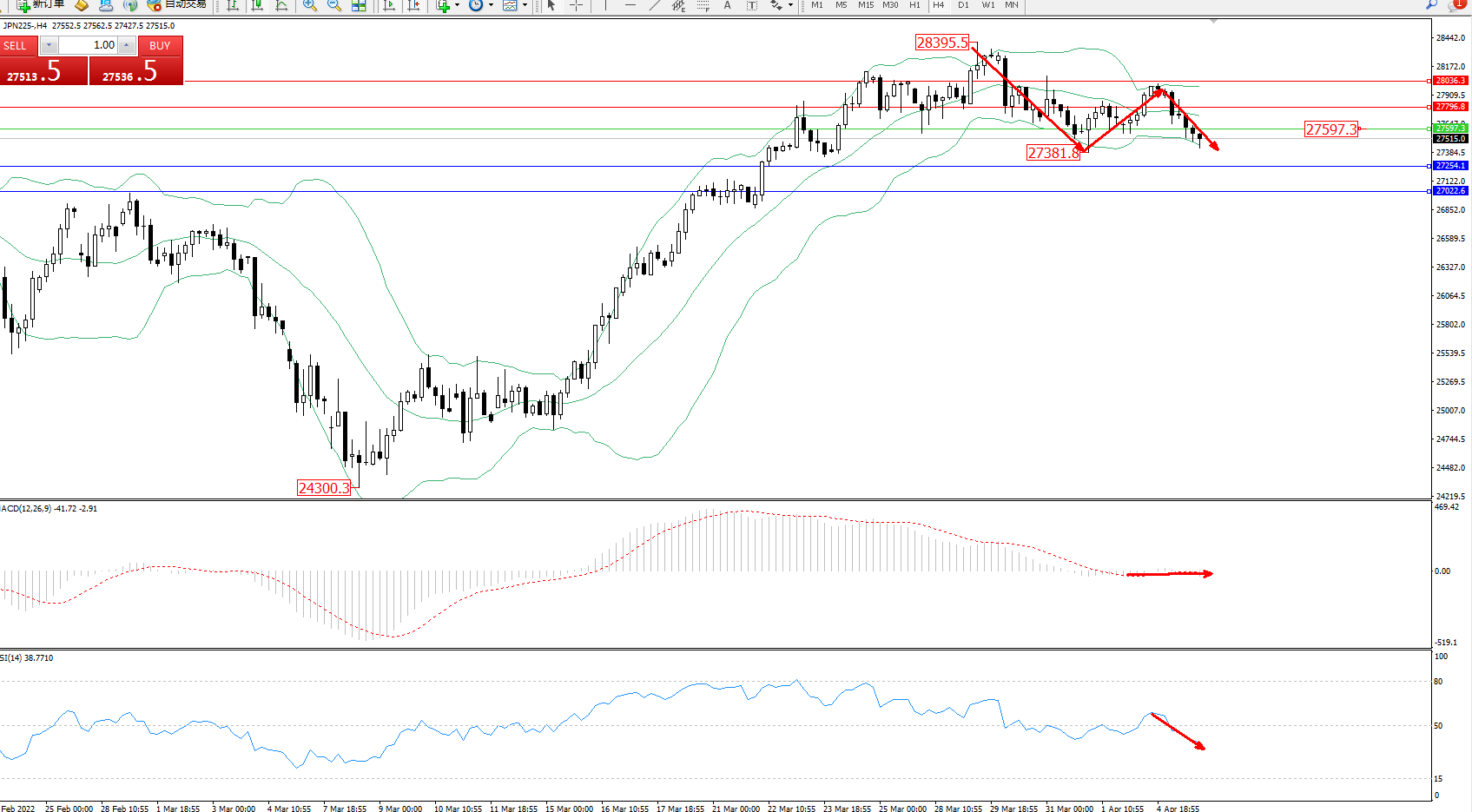 日经指数JPN225——4小时K线图显示: