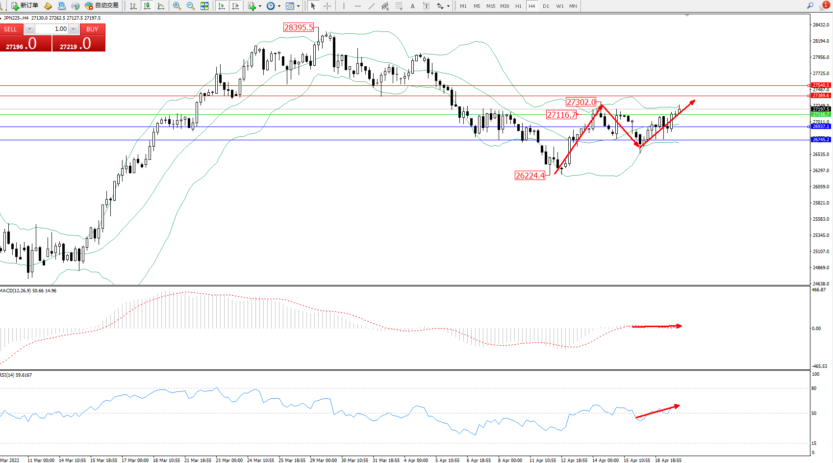 日经指数JPN225——4小时K线图显示: