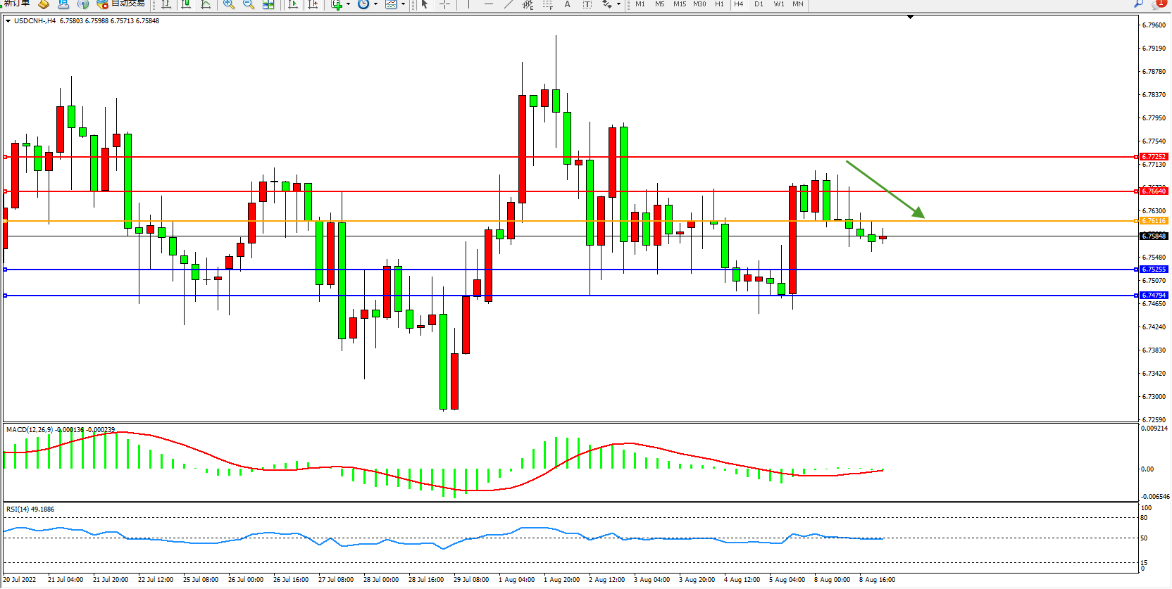交易策略:6.76116下方看跌,目标6.75255、6.74794