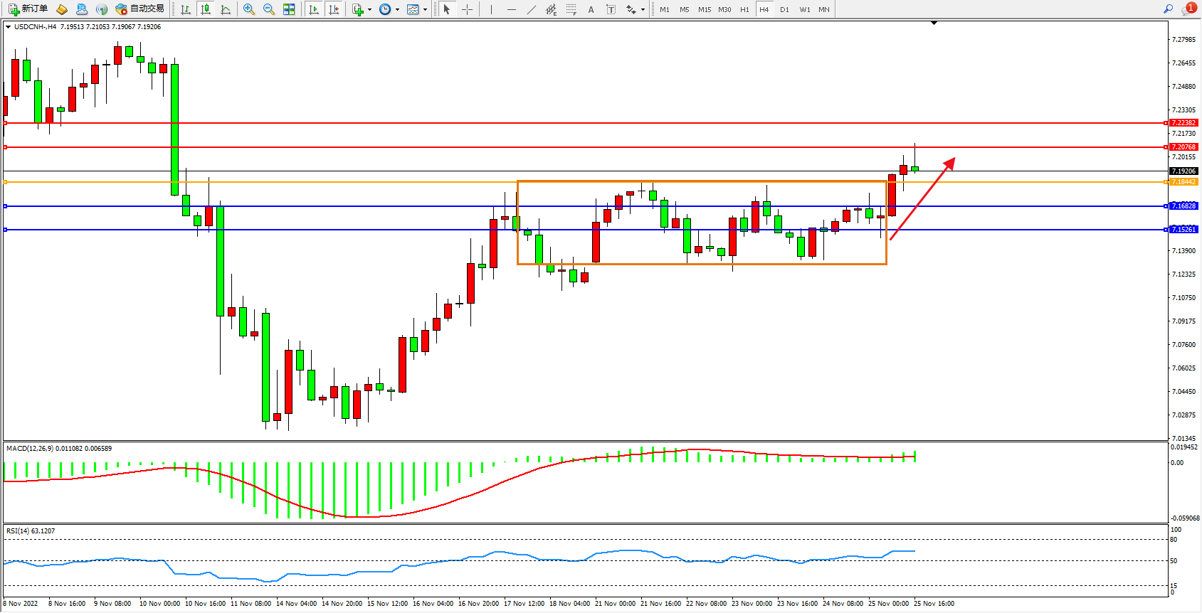 交易策略:7.18442上方看涨,目标7.20768、7.22382