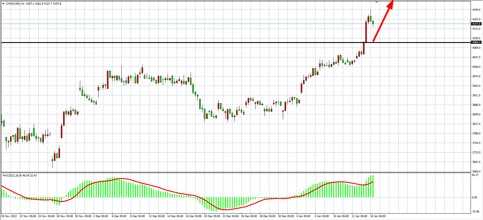 1小时图看,沪深300在4060点之上持续走强,同时MACD量能在零轴之上继续呈现持续放量状态,上行趋势再度加速,当前支撑已上移4086附近,上方目标看4200-4250附近。