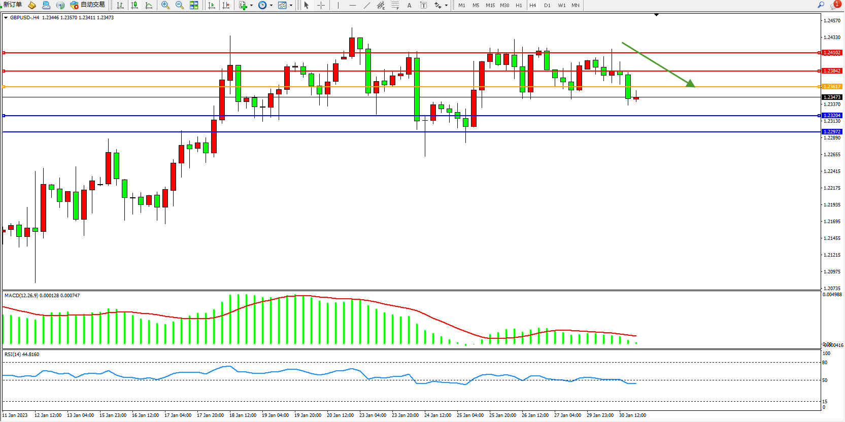 交易策略:1.23617下方看跌,目标1.23204、1.22972