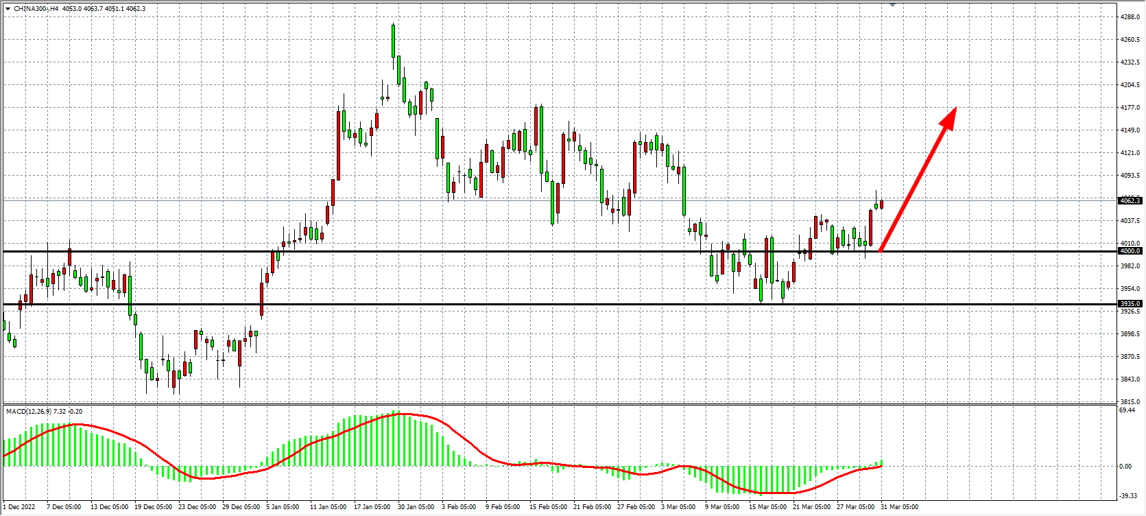 4小时图看,沪深300在400之上持续走高,MACD能量上穿零轴,同时整理区间上破,当前4000确认强支撑,该位之上看涨4100-4150附近。