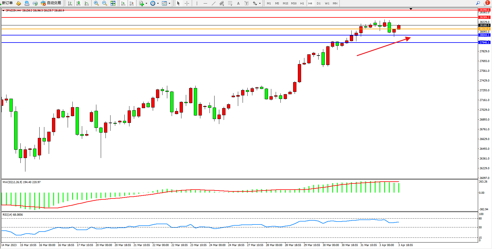 日经指数JPN225——4小时K线图显示: