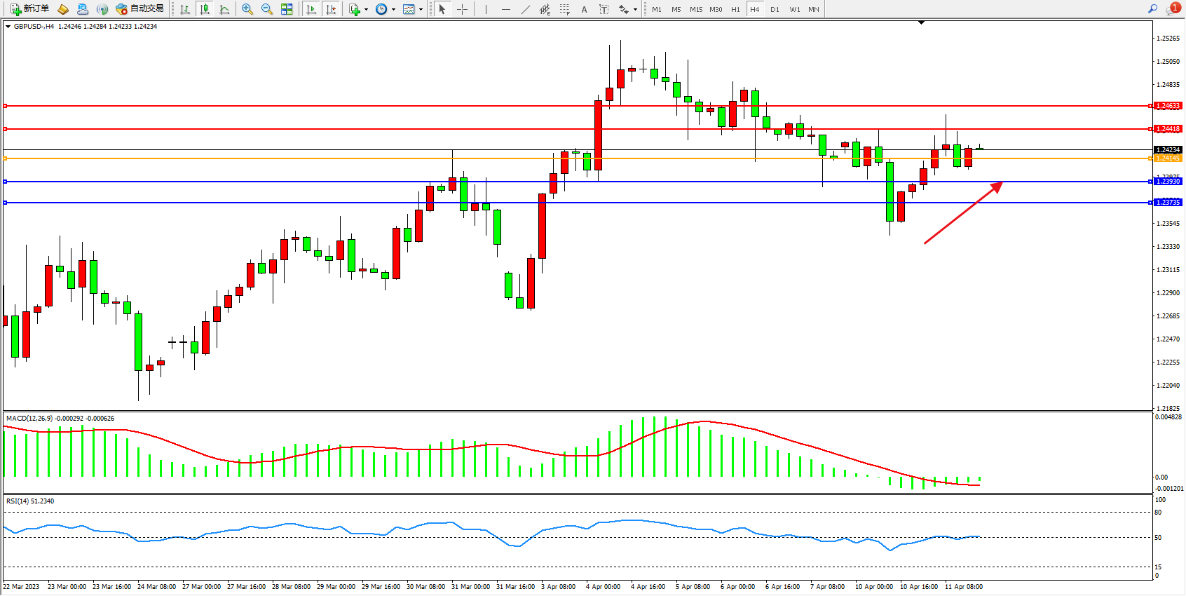 英镑美元GBPUSD ——4小时K线图显示: