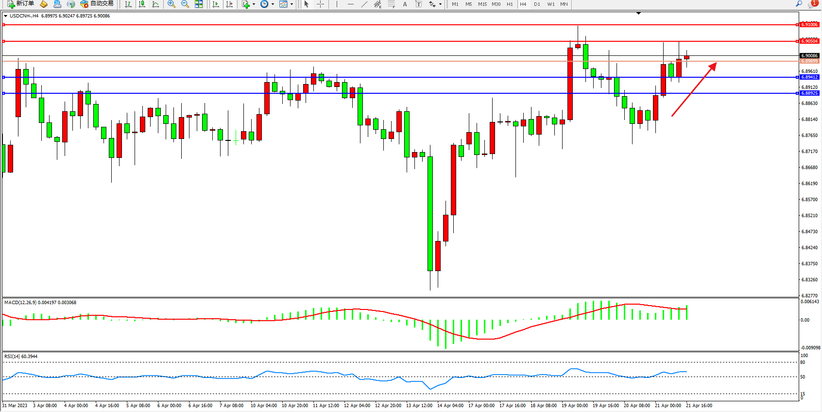 交易策略:6.89899上方看涨,目标6.90504  6.91006