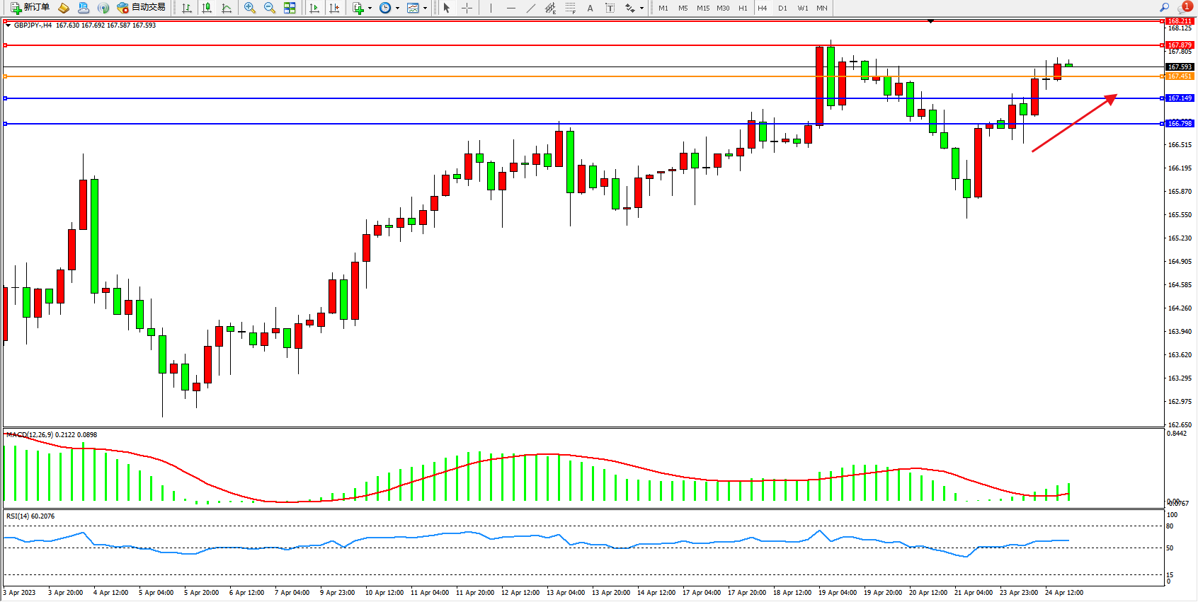 交易策略:167.451上方看涨,目标167.879 168.211