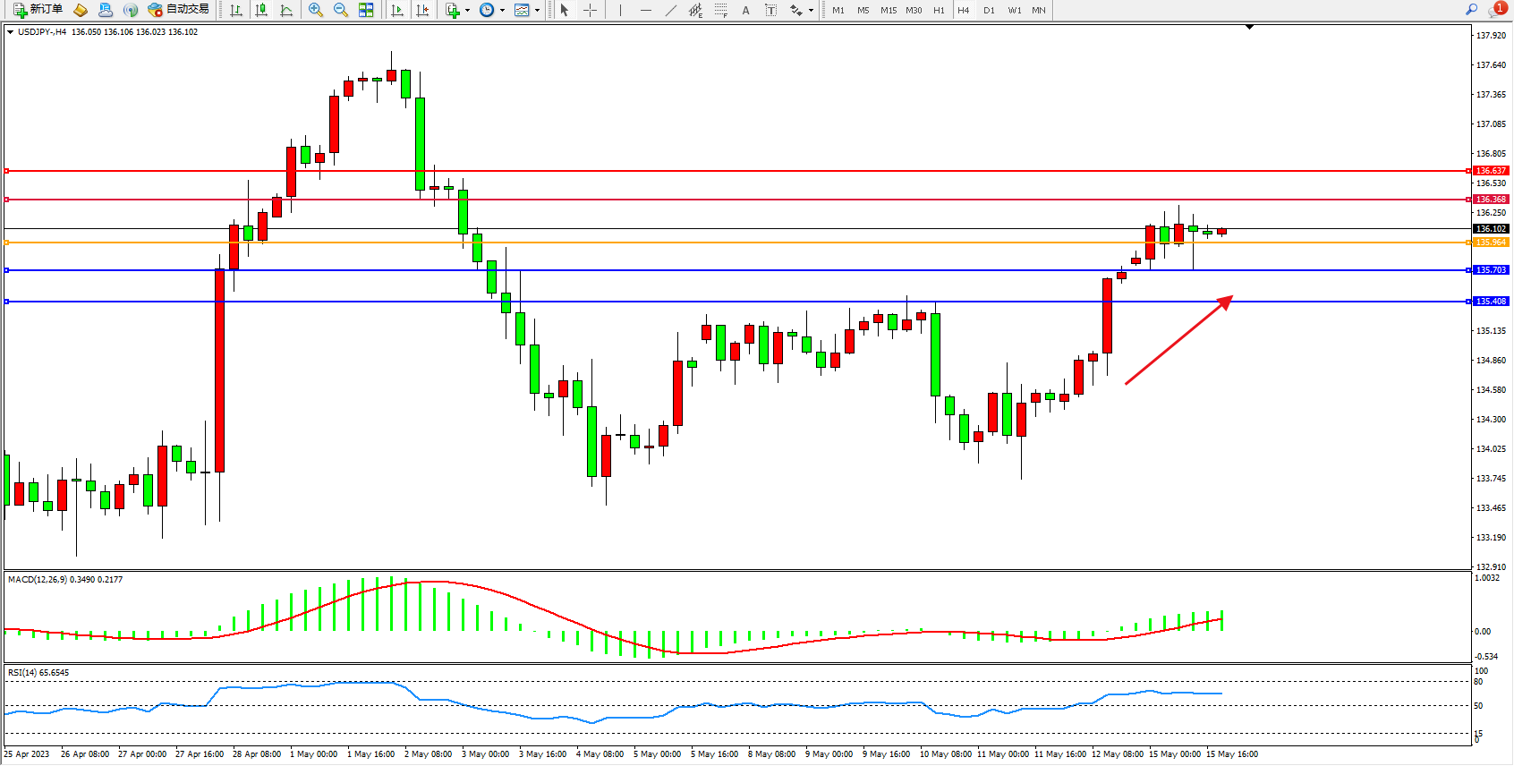 备选策略:135.964下方看跌,目标136.368 136.637